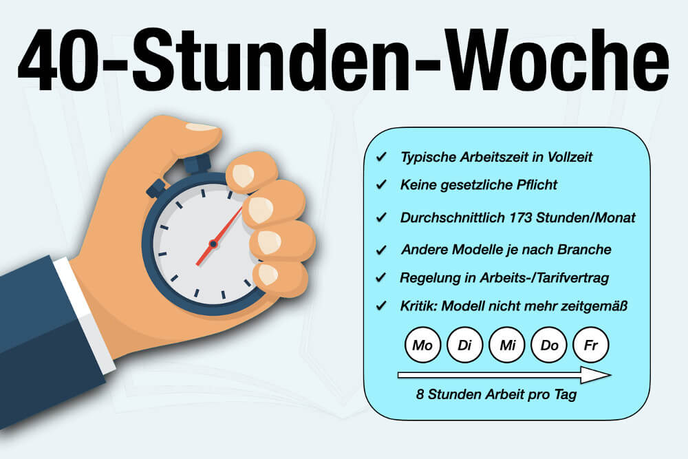 Die 40-Stunden-Woche ist die Bezeichnung für einen typischen Vollzeitjob in Deutschland, bei dem die regelmäßige Arbeitszeit pro Woche 40 Stunden beträgt. In der Praxis arbeiten Sie dabei meist 5 Tage pro Woche mit jeweils 8 Stunden pro Tag.